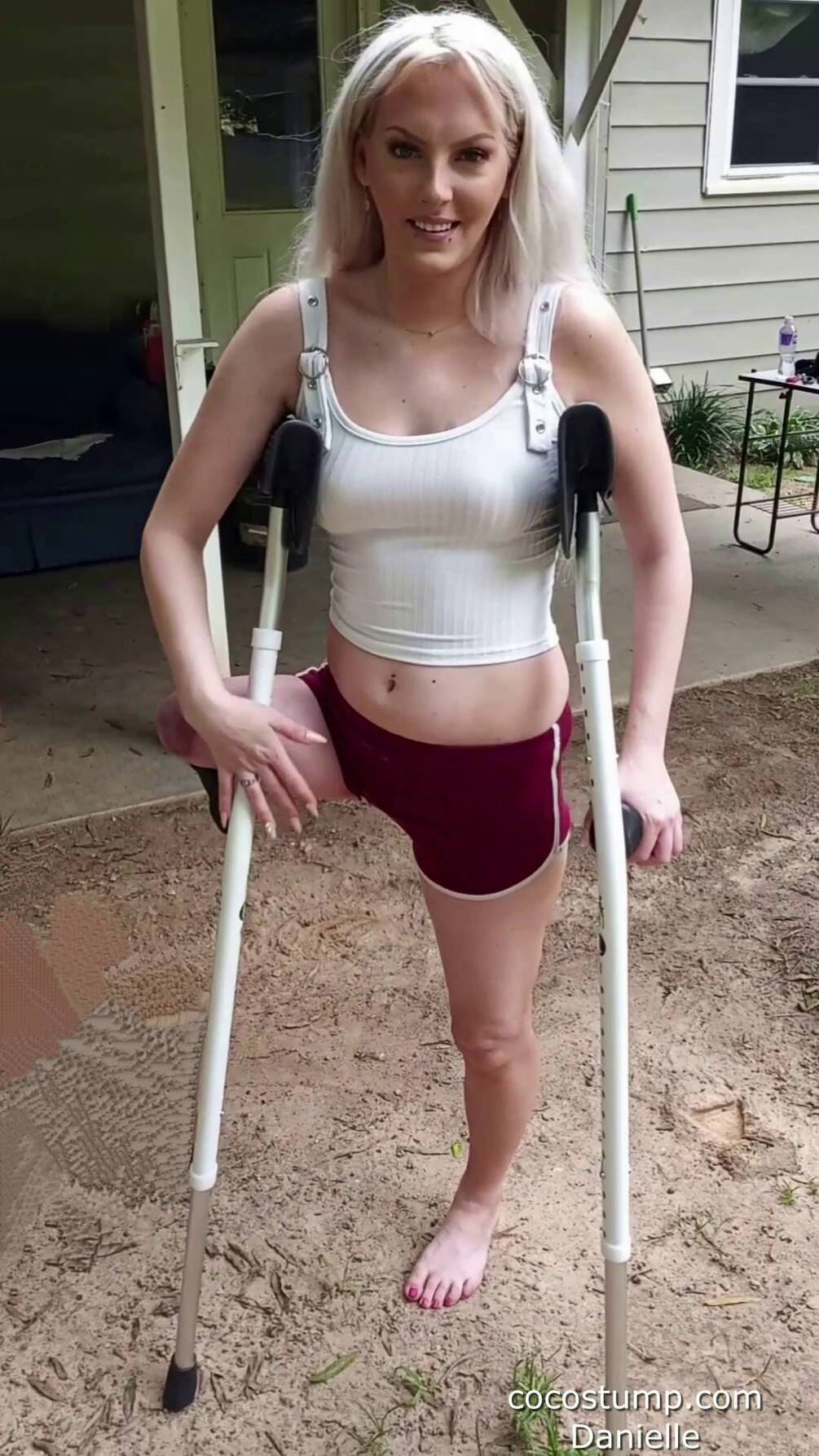 Watch beautiful Danielle unpacking and trying some new pairs of crutches. She also wears 3 different outfits. Wonderful posing and stump views. Great crutching.
