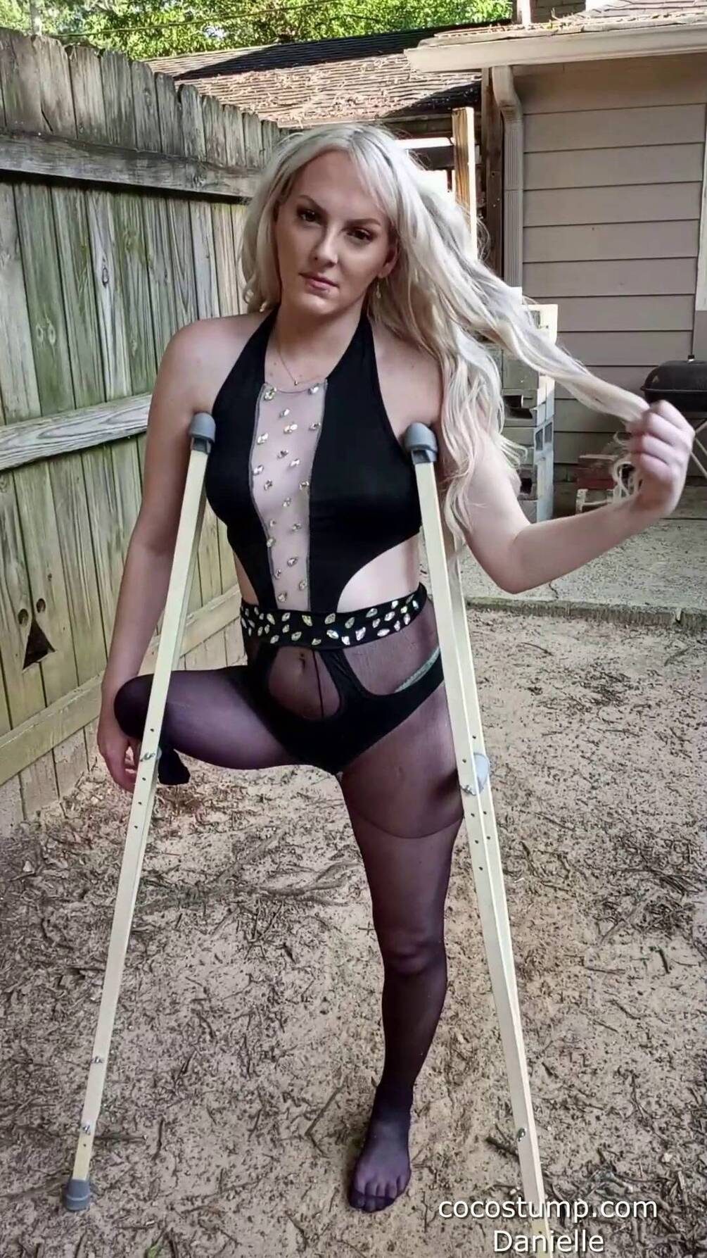 Watch awsome Danielle RAK, wearing two outfits. First she has a leather outfit and tries some forarm crutches. Second she is wearing a nyloned body with underarm crutches. Great Danielle and awsome stump views.